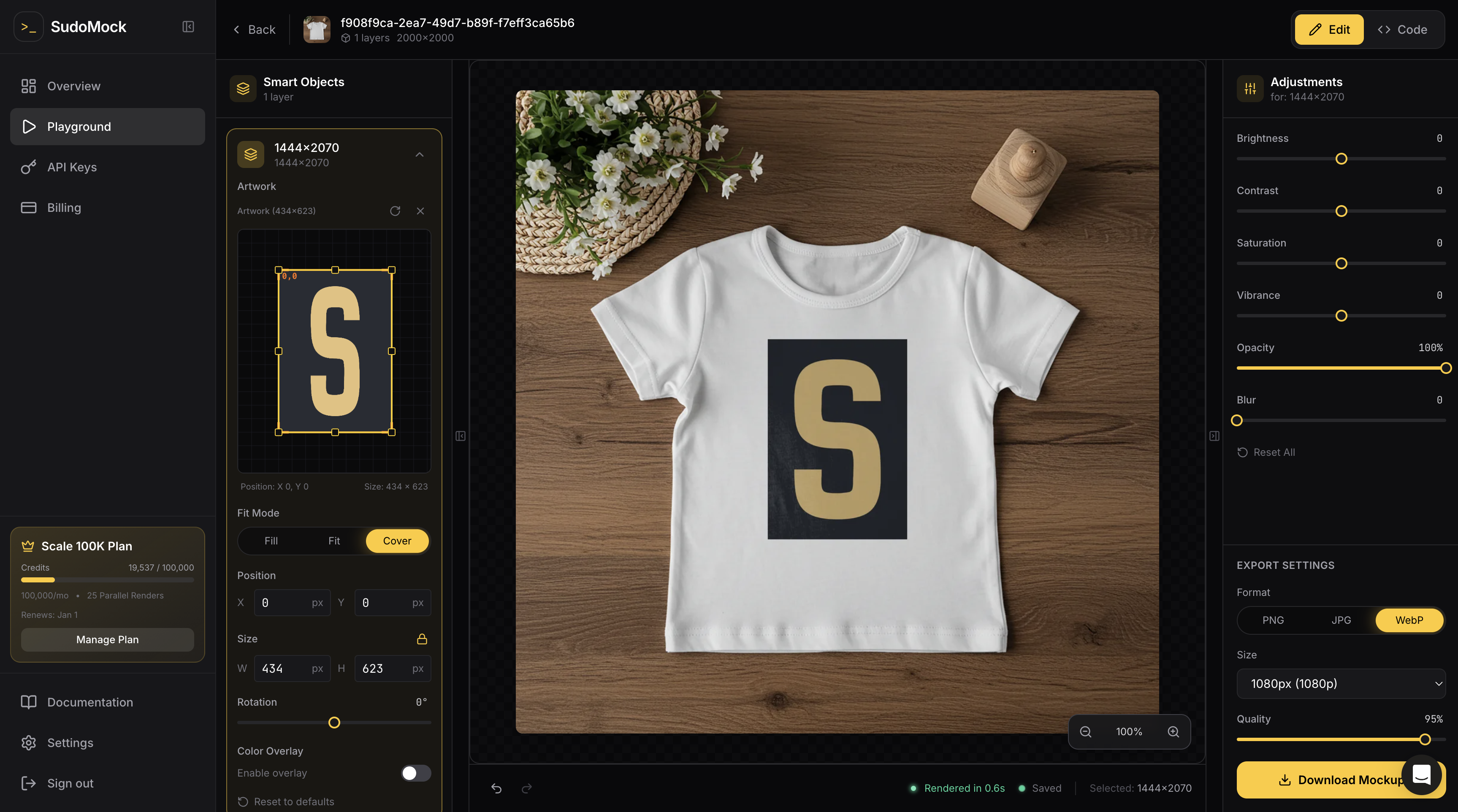 PSD mockup rendering API. Sub-second response at $0.002/render. Unlimited mockups on Dashboard, scal